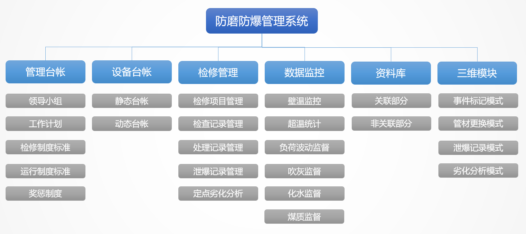 我國(guó)火力發(fā)電廠各種事故中,鍋爐事故約占發(fā)電廠總事故的70%以上,而過(guò)熱器、再熱器、省煤器、水冷壁四類管(簡(jiǎn)稱“四管”)泄漏與爆破事故時(shí)有發(fā)生,在眾多事故中出現(xiàn)較多,約占鍋爐總事故的70%以上,成為困擾火力發(fā)電廠安全生產(chǎn)的一大難題。針對(duì)這一問(wèn)題,云酷科技設(shè)計(jì)了防磨防爆可視化管理系統(tǒng)。