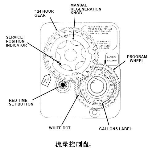 按樹脂罐內(nèi)裝填樹脂的交換能力算出周期制水量,減去必要的儲備量后的值就是所設(shè)定的流量。向外提出流量盤并轉(zhuǎn)動,使設(shè)定的流量數(shù)對準(zhǔn)流量盤上的白色圓點(diǎn),然后松開流量盤,注意讓齒輪嚙合好。