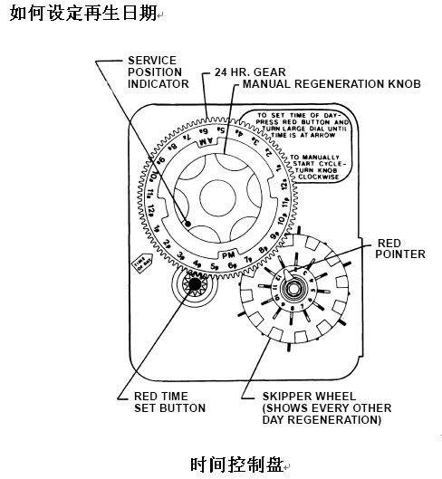 當(dāng)外面的一個微開關(guān)接觸到注水銷孔末端的兩根銷子時,再生程序終止。可是定時器會繼續(xù)旋轉(zhuǎn)直至里面的一個微開關(guān)接觸臂轉(zhuǎn)至定時器的圓形凹口內(nèi)為止。